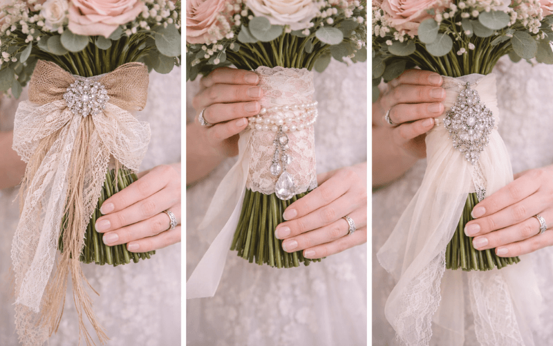 Rendas e tecidos adicionados ao buquê como detalhe visual
