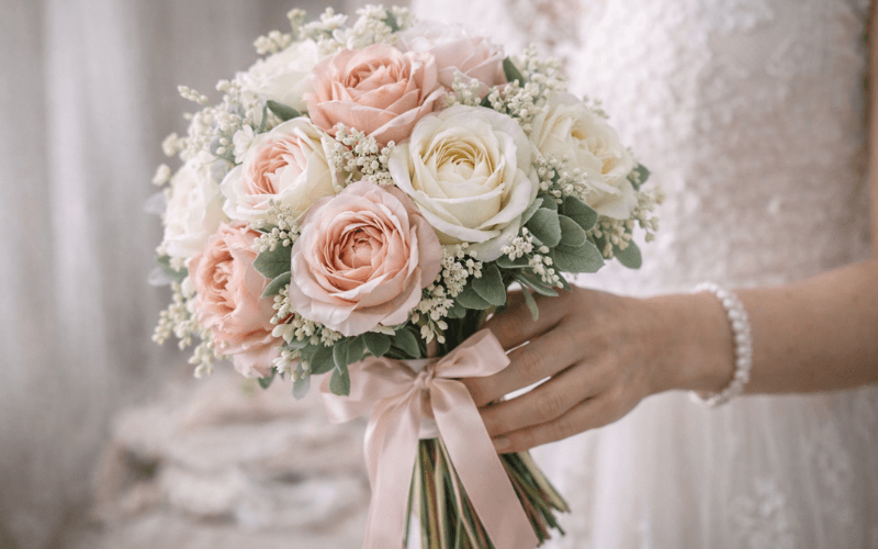 Cores também são um pilar do estilo clássico. Esqueça contrastes fortes ou tons vibrantes demais o clássico valoriza paletas suaves, tons neutros e variações discretas de uma mesma família de cor. Essas escolhas transmitem tranquilidade e garantem que o buquê permaneça elegante em qualquer época.
