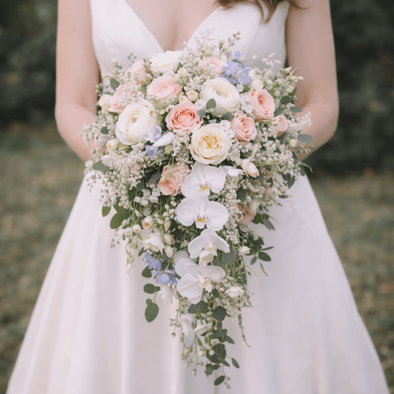 Diferente dos buquês mais arredondados, que concentram o volume nas mãos da noiva, o cascata cria uma linha descendente. O olhar percorre o arranjo de cima para baixo, gerando sensação de fluidez.