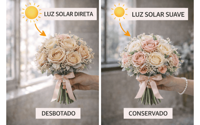 Superfícies claras ou espelhadas também ampliam a exposição, refletindo a luz diretamente sobre o buquê. Mesmo sem contato direto com o sol, o efeito se soma diariamente.