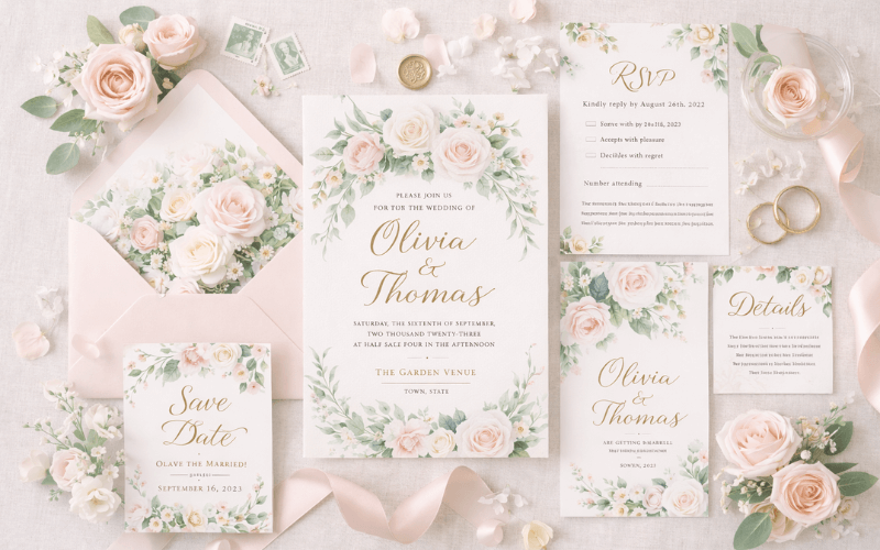 O convite não precisa ser o mais caro para ser marcante. Seja um convite de casamento elegante, um convite de casamento clássico, um convite de casamento minimalista, um convite de casamento verde oliva ou um convite de casamento azul serenity, o mais importante é que ele represente o estilo do casal.
