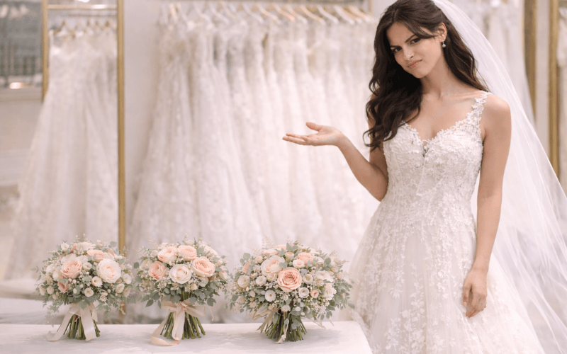 Por isso, ao experimentar o buquê com o vestido, observe-se no espelho. Veja como você se sente. Se ele completa sua presença sem esforço, é um ótimo sinal.